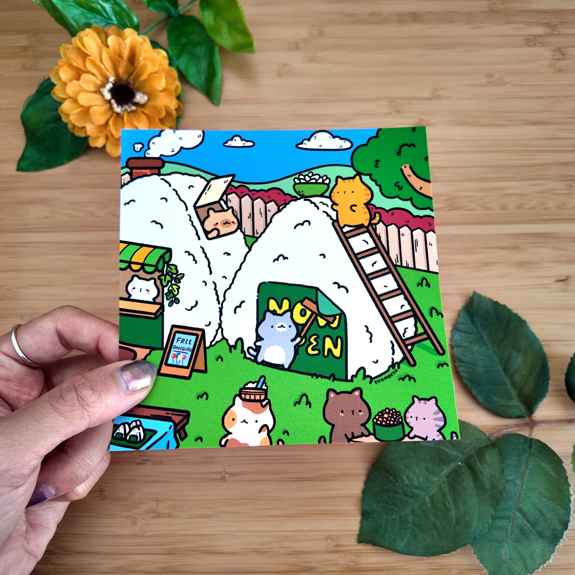 Add some cuteness to your home with our Onigiri Village Art Print! This wall art features adorable cats that are making a home amongst some giant onigiris. Perfect for any cat and onigiri lover!