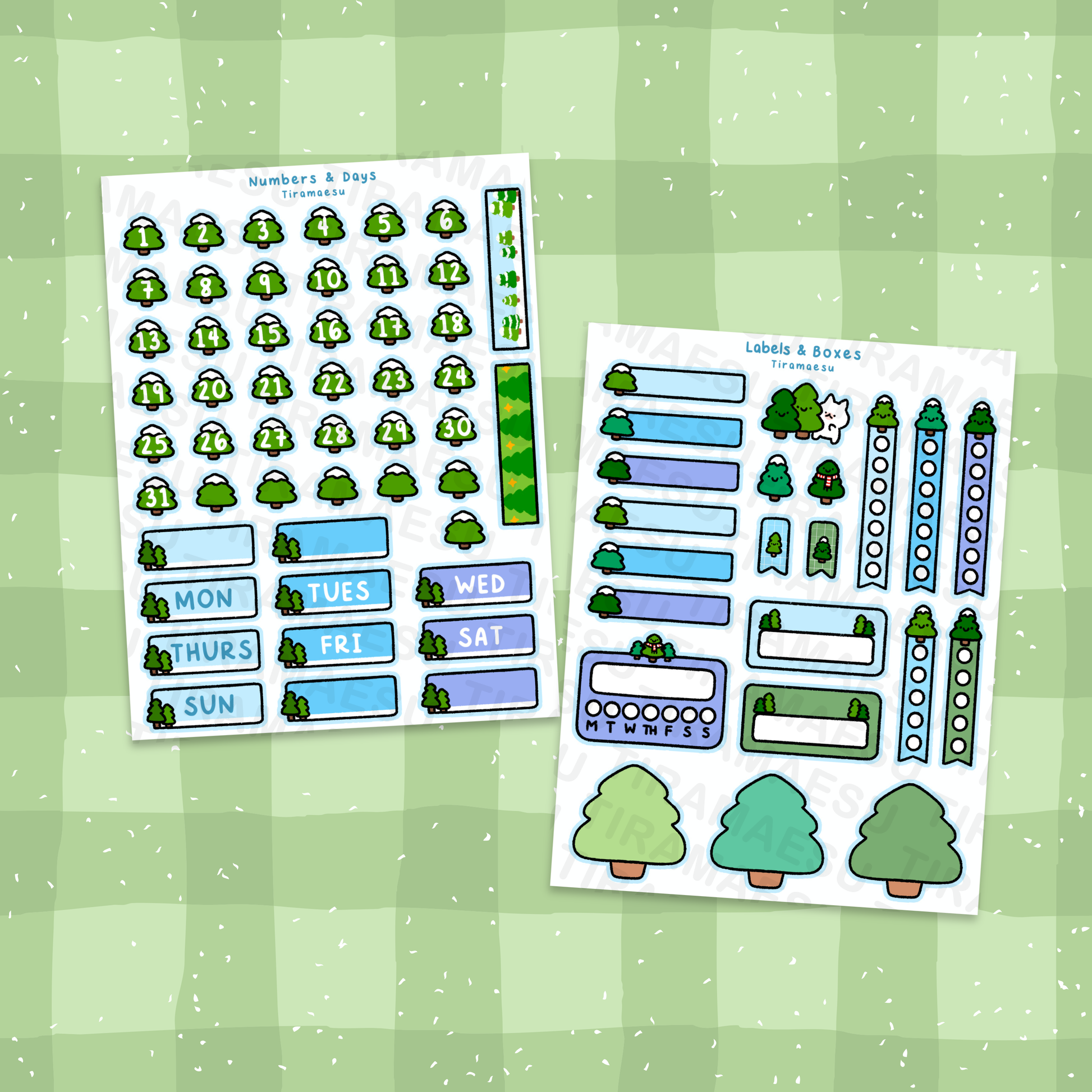 Celebrate the winter season with Pine Trees Planner Sticker Sheets! Choose from the Numbers and Days sheet, the Labels and Boxes sheet, or both to add cute winter tree-themed functional stickers to your planner. Perfect for organizing your schedule while bringing a cozy and seasonal winter touch to your planner spread!